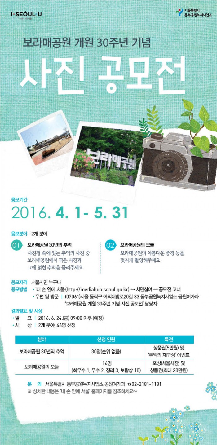 첫 주제인 '보라매공원 30년의 추억'은 시민들이 보라매공원과 함께한 30년을 돌아보는 것을 의미하며, 보라매공원에서의 추억이 담겨있는 사진과 사연을 응모하면 된다.
