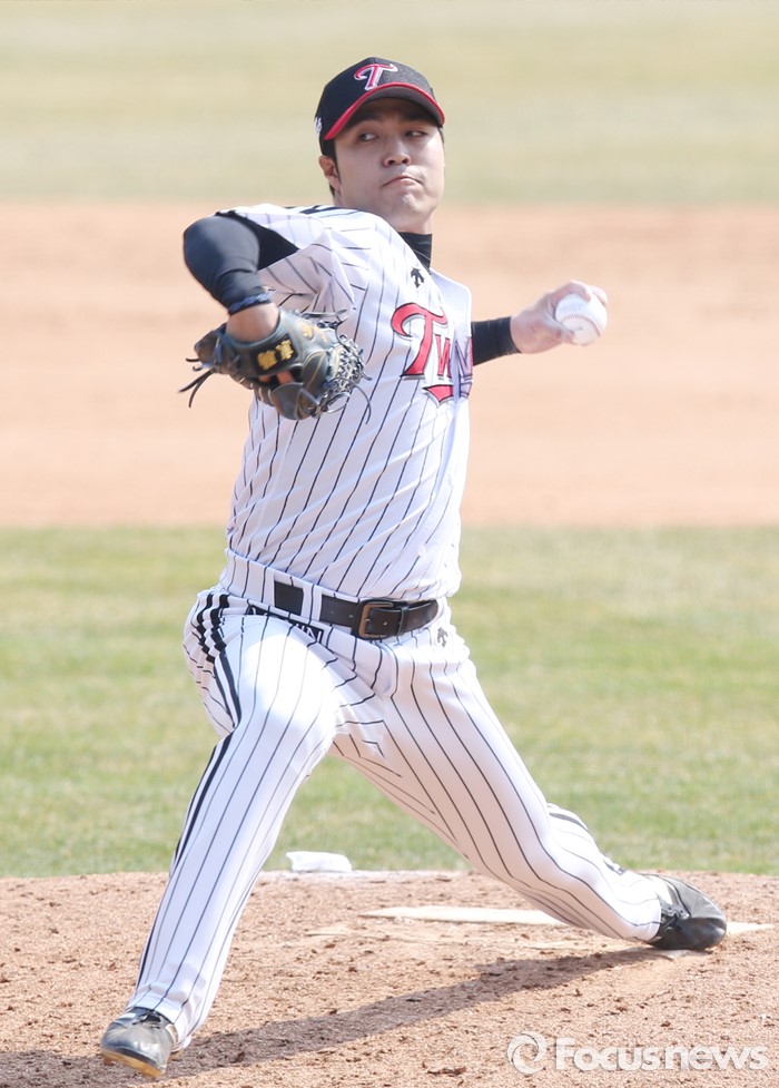 (서울=포커스뉴스) 27일 서울 잠실구장에서 열린 2016프로야구 시범경기 두산-LG 경기에서 LG 투수 최성훈이 투구하고 있다.