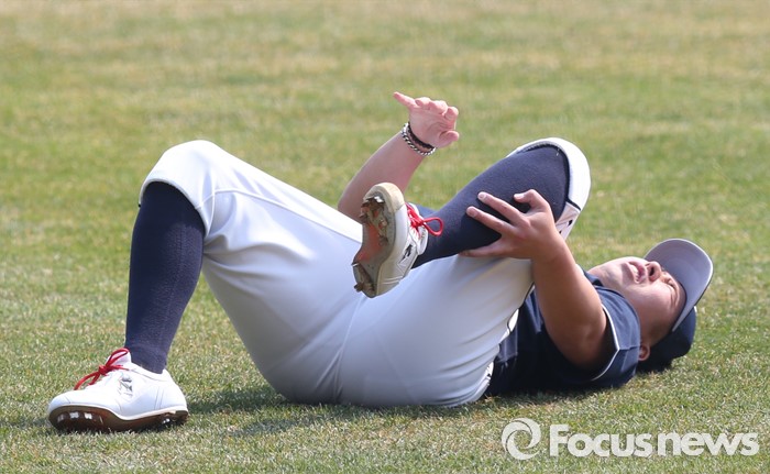 (서울=포커스뉴스) 27일 서울 잠실구장에서 열린 2016프로야구 시범경기 두산-LG 경기에서 5회말 LG 채은성의 타구에 왼쪽 정강이를 맞은 두산 투수 유희관이 그라운드에 넘어져 통증을 호소하고 있다.