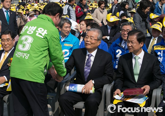 (광주=포커스뉴스) 김종인(가운데) 더불어민주당 비대위 대표와 장병완(왼쪽) 국민의당 정책위의장이 27일 오후 광주광역시청 문화광장에서 열린 2016 부활절 연합예배에 참석해 인사하고 있다. 오른쪽은 천정배 국민의당 공동대표.