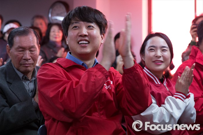 (서울=포커스뉴스) 이준석 새누리당 서울 노원병 후보가 27일 오후 서울 노원구 자신의 선거사무소 개소식에서 손수조 후보와 박수를 치고 있다.