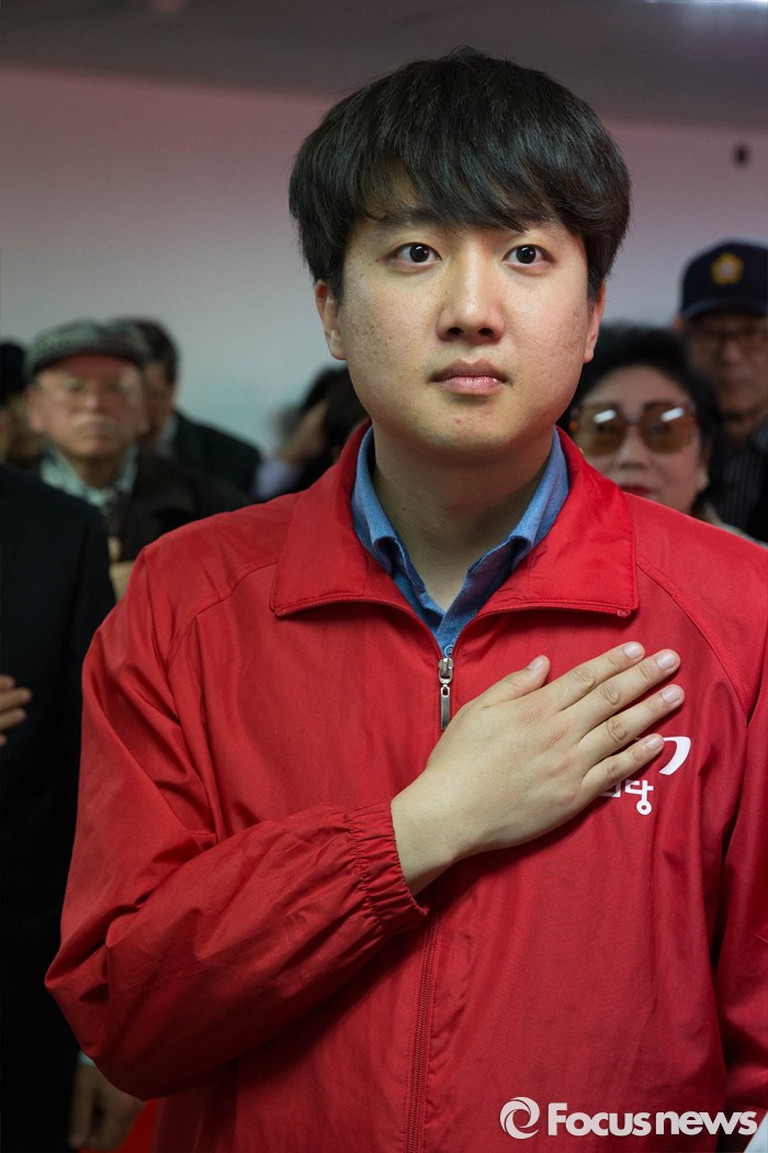 (서울=포커스뉴스) 이준석 새누리당 서울 노원병 후보가 27일 오후 노원구 자신의 선거사무소 개소식에서 국민의례를 하고 있다.