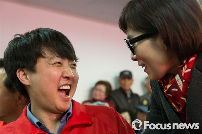 (서울=포커스뉴스) 이준석(왼쪽) 새누리당 노원병 후보가 27일 오후 노원구 자신의 선거사무소 개소식에 참석한 가수 장혜진과 인사하고 있다.