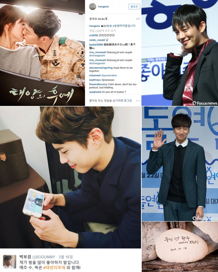 드라마 '태양의 후예'는 '우르크'라는 가상의 장소에 파병된 군인과 의사들의 이야기를 담고 있다. 극한 상황 속에서도 사랑하고 연대하는 사람들의 이야기를 담은 휴먼멜로 드라마다.배우 유아인, 박보검이 소셜네트워트서비스(SNS)를 통해 KBS2 수목드라마 '태양의 후예'에 빠졌음을 밝혔다. 이광수도 송중기와의 친분을 넘어 '태양의 후예' 팬임을 자청했다. 사진은 유아인 SNS, 이광수, 박보감 SNS(왼쪽 위부터 시계방향). 포커스뉴스DB <사진출처=유아인, 박보검 SNS, NEW 페이스북>