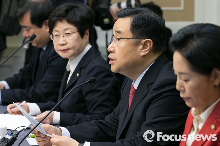 (서울=포커스뉴스) 김정훈(오른쪽 두번째) 새누리당 정책위의장이 28일 오전 서울 여의도 국회에서 열린 누리과정 등 교육현안 관련 당정협의에 참석해 모두발언하고 있다.