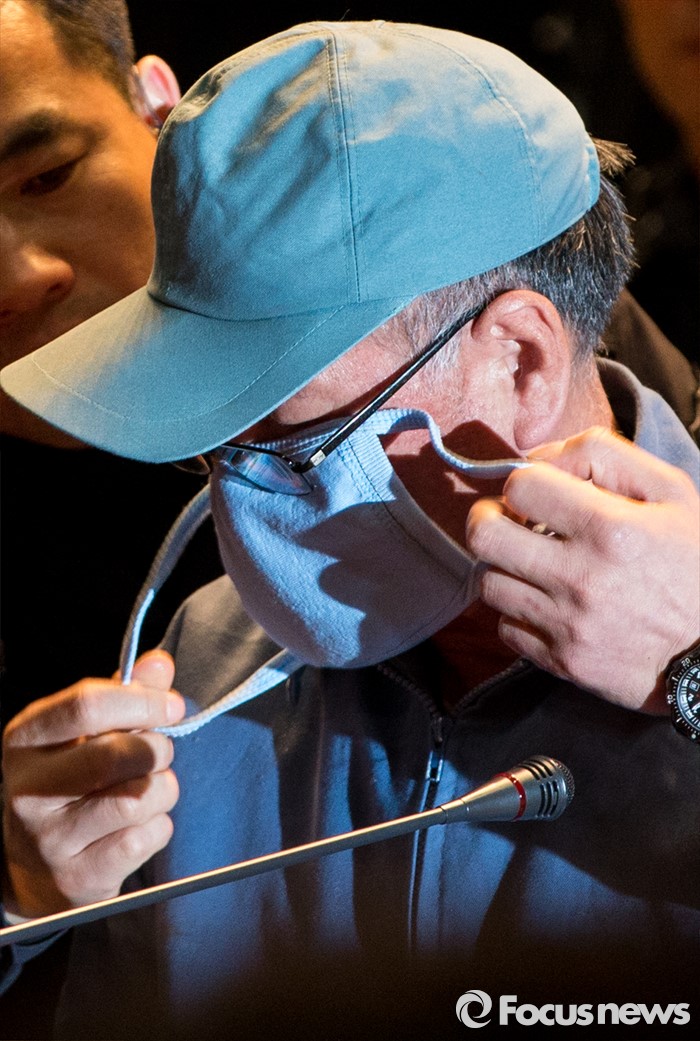 (서울=포커스뉴스) 28일 오전 서울시청 다목적홀에서 세월호 참사 특별조사위원회의 제2차 청문회가 열렸다. 이날 청문회에 증인으로 참석한 이준석 선장이 마스크를 벗고 있다.