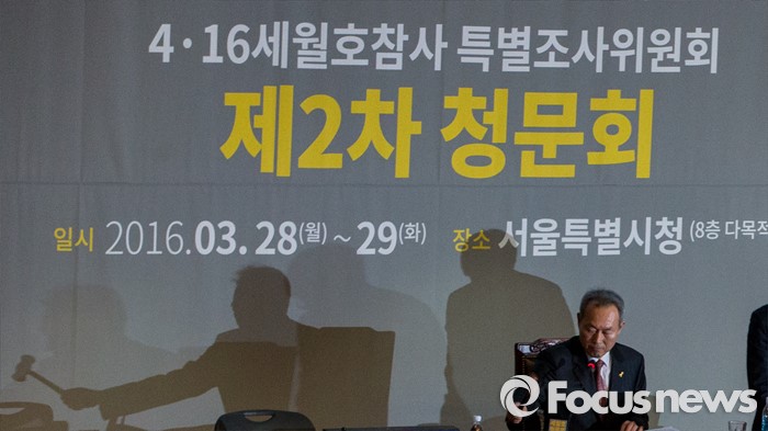 (서울=포커스뉴스) 28일 오전 서울시청 다목적홀에서 세월호 참사 특별조사위원회의 제2차 청문회가 열렸다. 이날 청문회에 참석한 이석태 위원장이 의사봉을 두드리며 개회를 선언하고 있다.