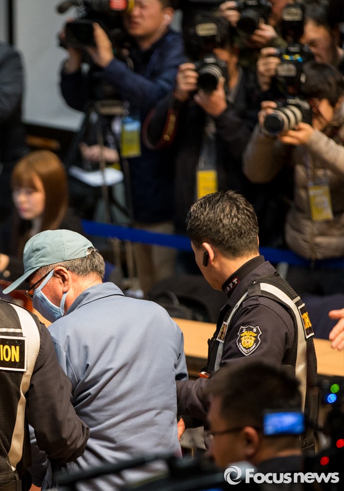 (서울=포커스뉴스) 28일 오전 서울시청 다목적홀에서 세월호 참사 특별조사위원회의 제2차 청문회가 열렸다. 이날 청문회에 증인으로 참석한 이준석 선장이 증인석으로 향하고 있다.
