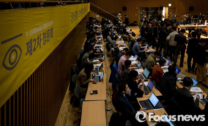 (서울=포커스뉴스) 28일 오전 서울시청 다목적홀에서 세월호 참사 특별조사위원회의 제2차 청문회가 열렸다. 이날 청문회장 뒤편이 취재진으로 가득차 있다.