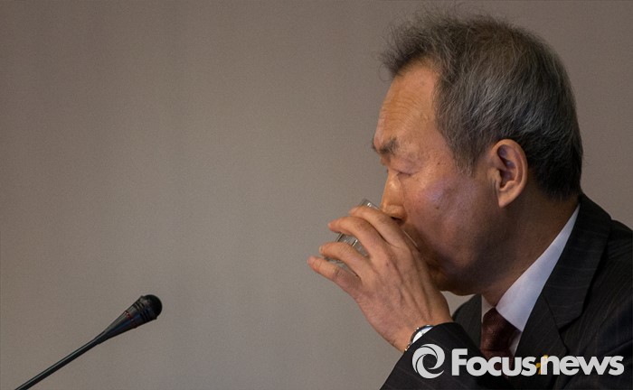 (서울=포커스뉴스) 28일 오전 서울시청 다목적홀에서 세월호 참사 특별조사위원회의 제2차 청문회가 열렸다. 이날 청문회에 참석한 이석태 위원장이 물을 마시고 있다.