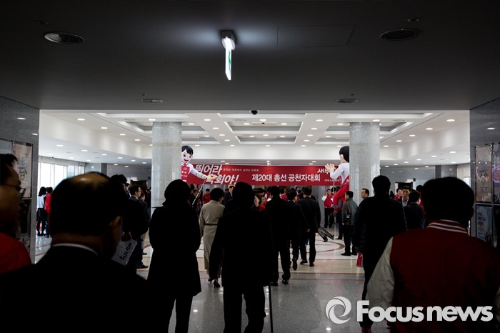 (서울=포커스뉴스) 28일 오후 서울 영등포구 국회 의원회관에서 열린 '20대 총선 새누리당 공천자대회'에서 각 지역 후보자들이 행사장으로 이동 하고 있다.