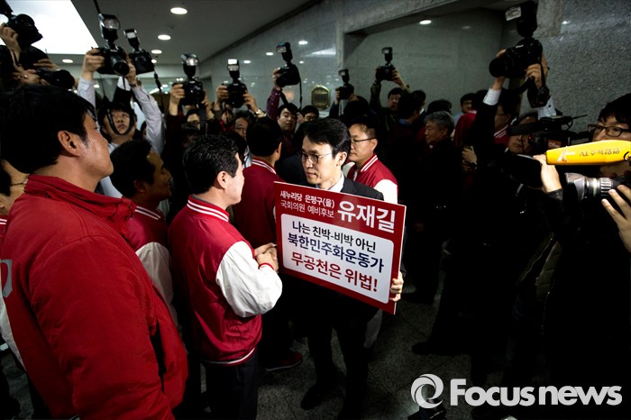 (서울=포커스뉴스) 새누리당의 무공천 결정으로 4.13 총선 서울 은평을 출마가 무산된 유재길 예비후보가 28일 오후 20대 총선 새누리당 공천자대회가 열리는 서울 영등포구 국회 의원회관에서 피켓 시위를 벌이고 있다.