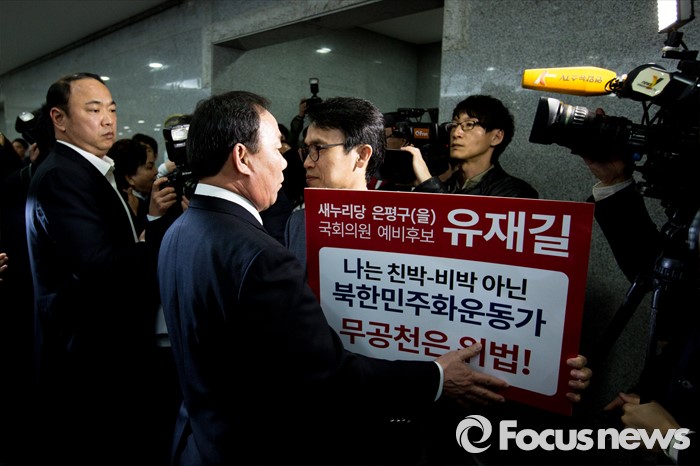 | △ 피켓 시위 제지 당하는 새누리당 유재길 은평을 예비후보 |
