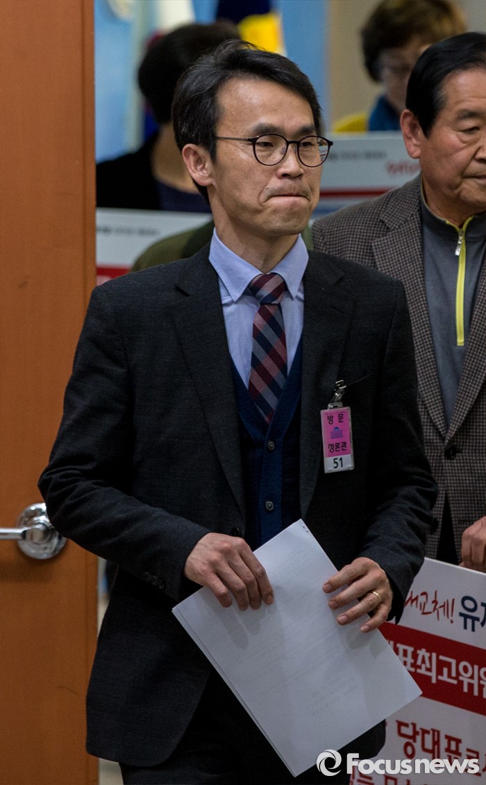 (서울=포커스뉴스) 새누리당의 무공천 결정으로 4.13 총선 서울 은평을 출마가 무산된 유재길 예비후보가 28일 오후 서울 영등포구 국회에서 무공천 결정에 관한 대응 방안을 발표 한 뒤 정론관을 나서고 있다.