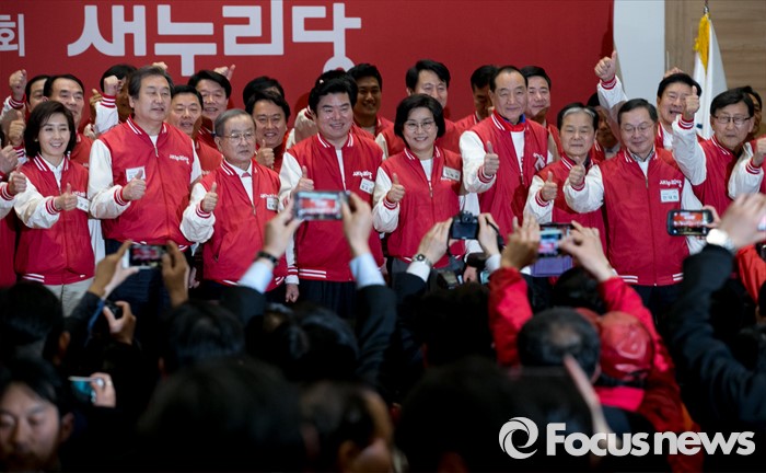 (서울=포커스뉴스) 28일 오후 서울 여의도 국회 의원회관에서 열린 새누리당 20대 총선 공천자대회에 참석한 김무성 공동선대위원장 등 지도부와 서울지역 후보들이 기념촬영을 하고 있다.