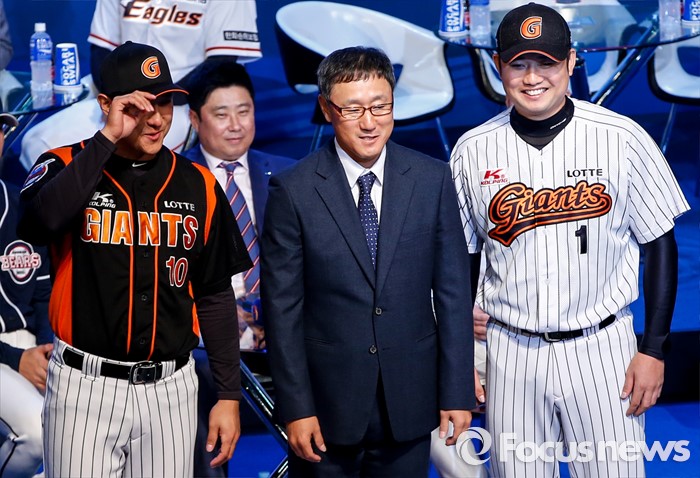 (서울=포커스뉴스) 28일 오후 서울 용산구 브루스퀘어 삼성카드홀에서 열린 '2016 타이어뱅크 프로야구 미디어데이 & 팬페스트' 행사에 참석한 롯데 자이언츠 조원우 감독(가운데)과 황재균, 손승락이 포즈를 취하고 있다.