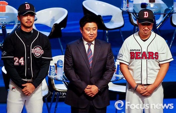 (서울=포커스뉴스) 28일 오후 서울 용산구 브루스퀘어 삼성카드홀에서 열린 '2016 타이어뱅크 프로야구 미디어데이 & 팬페스트' 행사에 참석한 두산 베어스 김태형 감독(가운데)과 오재원, 유희관이 포즈를 취하고 있다.