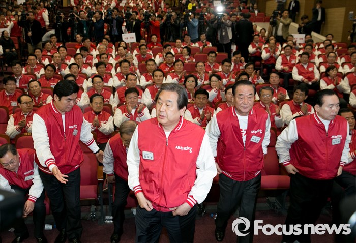 (서울=포커스뉴스) 28일 오후 서울 여의도 국회 의원회관에서 열린 새누리당 20대 총선 공천자대회에 참석한 원유철(왼쪽부터), 강봉균, 김무성, 서청원, 이인제 공동선대위원장이 단상을 오르고 있다.