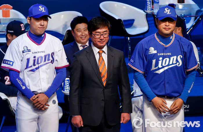(서울=포커스뉴스) 28일 오후 서울 용산구 브루스퀘어 삼성카드홀에서 열린 '2016 타이어뱅크 프로야구 미디어데이 & 팬페스트' 행사에 참석한 삼성 라이온즈 류중일 감독(가운데)과 박한이, 차우찬이 포즈를 취하고 있다.