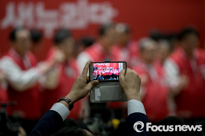 (서울=포커스뉴스) 28일 오후 서울 여의도 국회 의원회관에서 열린 새누리당 20대 총선 공천자대회에 한 참석자가 새누리당 지도부와 후보들의 모습을 촬영하고 있다.