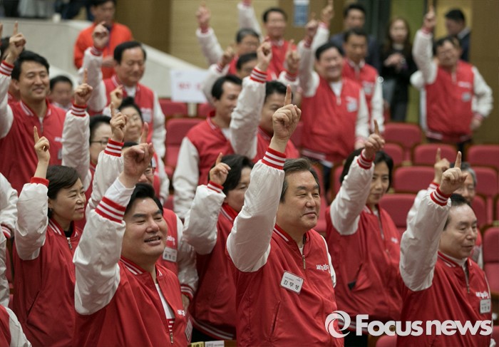 (서울=포커스뉴스) 28일 오후 서울 여의도 국회 의원회관에서 열린 새누리당 20대 총선 공천자대회에 참석자들이 김무성, 원유철 공동선대위원장 등 지도부와 후보들이 선거유세 율동을 배우고 있다.