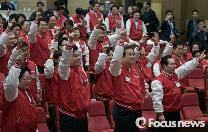(서울=포커스뉴스) 28일 오후 서울 여의도 국회 의원회관에서 열린 새누리당 20대 총선 공천자대회에 참석한 김무성, 원유철 공동선대위원장 등 지도부와 후보들이 선거유세 율동을 배우고 있다.