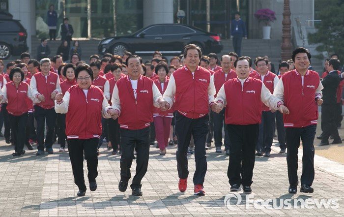 (서울=포커스뉴스) 28일 오후 서울 여의도 국회 의원회관에서 열린 새누리당 20대 총선 공천자대회를 마친 뒤 김무성, 원유철, 서청원 공동선대위원장 등 지도부와 후보들이 선거홍보용 영상을 촬영하고 있다.