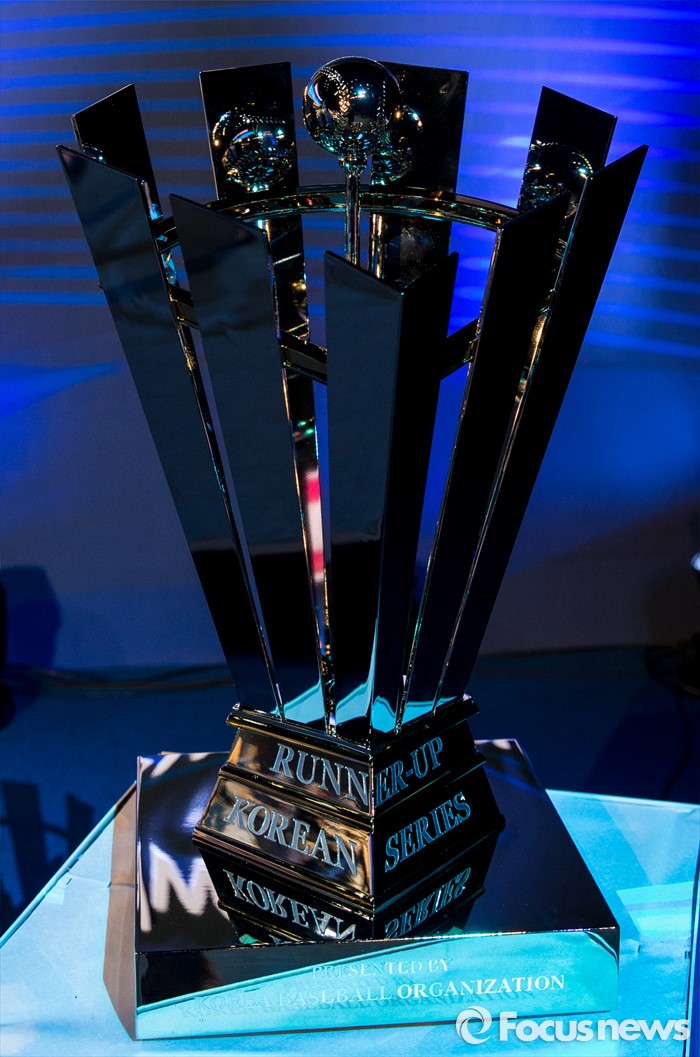 (서울=포커스뉴스) 28일 오후 서울 용산구 브루스퀘어 삼성카드홀에서 열린 '2016 타이어뱅크 프로야구 미디어데이 & 팬페스트' 행사에서 공개된 한국시리즈 우승트로피.