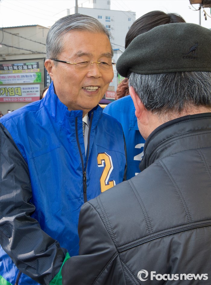 (진천=포커스뉴스) 김종인 더불어민주당 비상대책위 대표가 28일 오후 충북 진천군 중앙시장을 방문, 시민들과 인사를 하고 있다.