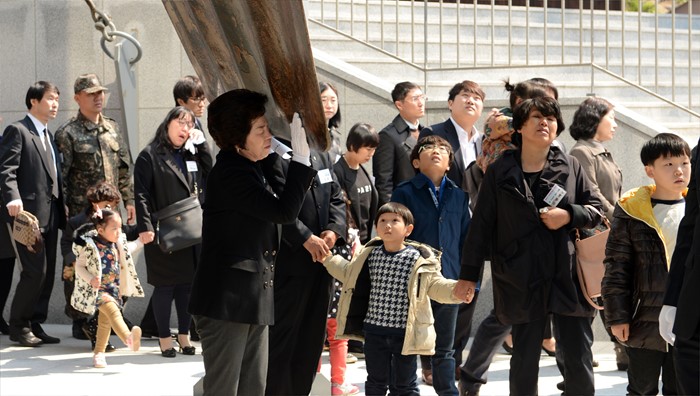 (서울=포커스뉴스) 26일 경기도 해군 2함대사령부에서 열린 '제6주기 천안함 추모식'에서 유가족들이 전시된 천안함을 주람하고 있다. <사진제공=해군>