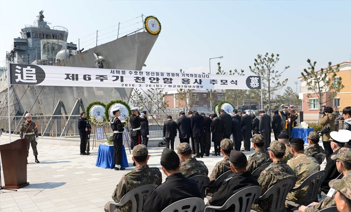 (서울=포커스뉴스) 26일 경기도 해군 2함대사령부에서 열린 '제6주기 천안함 추모식'에서 유가족 대표들이 천안함 46용사에 대한 묵념을 하고 있다. <사진제공=해군>