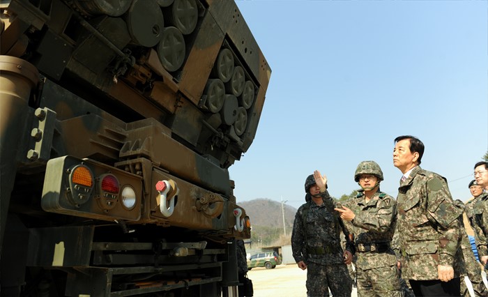 (서울=포커스뉴스) 한민구 국방부 장관이 28일 육군 최전방 부대를 방문, 다연장 로켓인 천무의 대비태세를 점검하고 있다. <사진제공=국방부>