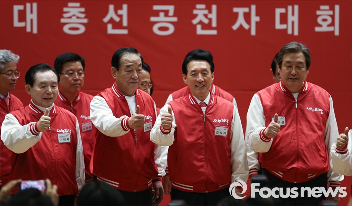 (서울=포커스뉴스) 28일 오후 서울 여의도 국회 의원회관에서 열린 새누리당 20대 총선 공천자대회에 참석한 지도부와 김석기 경북 경주 후보가 기념촬영을 하고 있다. 왼쪽부터 이인제, 서청원 공동선대위원장, 김 후보, 김무성 위원장.