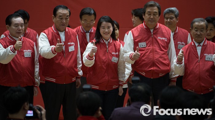 (서울=포커스뉴스) 28일 오후 서울 여의도 국회 의원회관에서 열린 새누리당 20대 총선 공천자대회에 참석한 지도부와 신보라 비례대표 후보가 기념촬영을 하고 있다. 왼쪽부터 이인제, 서청원 공동선대위원장, 신 후보, 김무성, 강봉균 공동선대위원장.