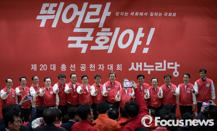 (서울=포커스뉴스) 28일 오후 서울 여의도 국회 의원회관에서 열린 새누리당 20대 총선 공천자대회에 참석한 인천 지역 후보들과 지도부가 기념촬영을 하고 있다.