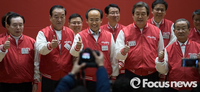 (서울=포커스뉴스) 28일 오후 서울 여의도 국회 의원회관에서 열린 새누리당 20대 총선 공천자대회에 참석한 추경호 대구 달성군 후보와 공동선대위원장들이 기념촬영을 하고 있다. 왼쪽부터 이인제, 서청원, 추 후보, 김무성, 강봉균 선대위원장.