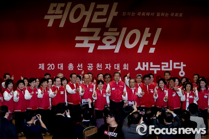 (서울=포커스뉴스) 28일 오후 서울 여의도 국회 의원회관에서 열린 새누리당 20대 총선 공천자대회에 참석한 지도부와 비례대표 후보들이 기념촬영을 하고 있다.