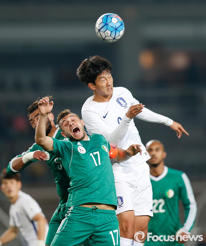 (고양=포커스뉴스) 28일 오후 경기 고양종합운동장에서 열린 올림픽축구대표팀 2차 평가전 대한민국과 알제리의 경기에서 한국 김현이 헤딩으로 패스를 하고 있다.