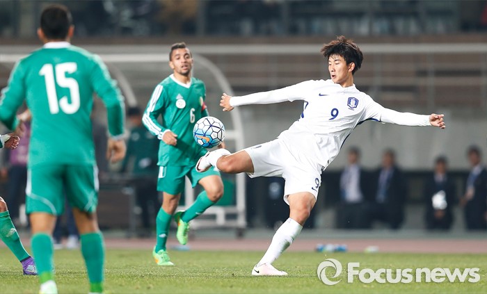 (고양=포커스뉴스) 28일 오후 경기 고양종합운동장에서 열린 올림픽축구대표팀 2차 평가전 대한민국과 알제리의 경기에서 한국 김현이 슛을 시도하고 있다.
