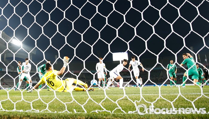 (고양=포커스뉴스) 28일 오후 경기 고양종합운동장에서 열린 올림픽축구대표팀 2차 평가전 대한민국과 알제리의 경기에서 한국 김현의 슛을 알제리 골키퍼 파리드 칼이 막아내고 있다.