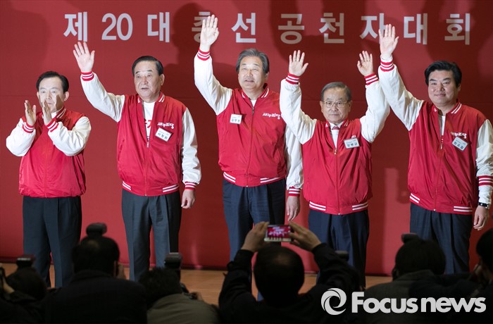 한편 이날 열린 첫 선대위회의에는 김무성 새누리당 대표와 강봉균 전 재정경제부 장관, 원유철 원내대표, 서청원·이인제 최고위원 등 5인의 공동선대위원장 전원이 참석했다.(서울=포커스뉴스) 28일 오후 서울 여의도 국회 의원회관에서 열린 새누리당 20대 총선 공천자대회에 참석한 공동선대위원장들이 인사하고 있다. 왼쪽부터 이인제, 서청원, 김무성, 강봉균, 원유철 위원장. 2016.03.28 박동욱 기자