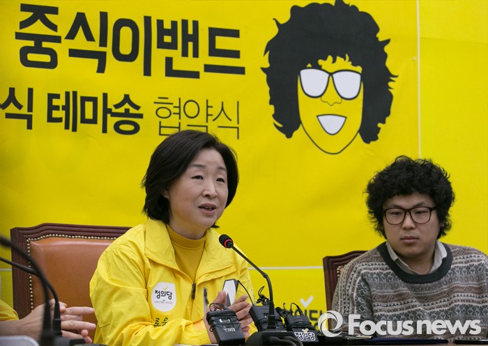 (서울=포커스뉴스) 29일 오전 서울 여의도 국회에서 열린 정의당-중식이밴드 2016 총선 공식 테마송 협약식에 참석한 심상정 상임선대위원장이 인사말을 하고 있다. 오른쪽은 중식이밴드의 보컬 정중식.
