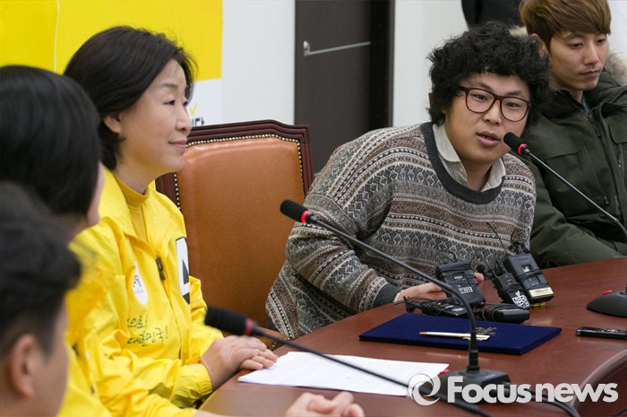 (서울=포커스뉴스) 29일 오전 서울 여의도 국회에서 열린 정의당-중식이밴드 2016 총선 공식 테마송 협약식에 참석한 중식이밴드의 보컬 정중식(오른쪽 두번째)가 인사말을 하고 있다. 오른쪽 세번째는 심상정 상임선대위원장.