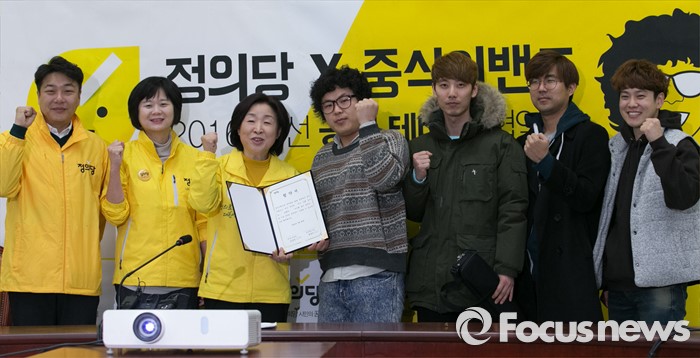 (서울=포커스뉴스) 29일 오전 서울 여의도 국회에서 열린 정의당-중식이밴드 2016 총선 공식 테마송 협약식에 참석한 심상정(왼쪽 세번째) 상임선대위원장과 중식이밴드가 협약서에 서명한 뒤 기념촬영을 하고 있다.