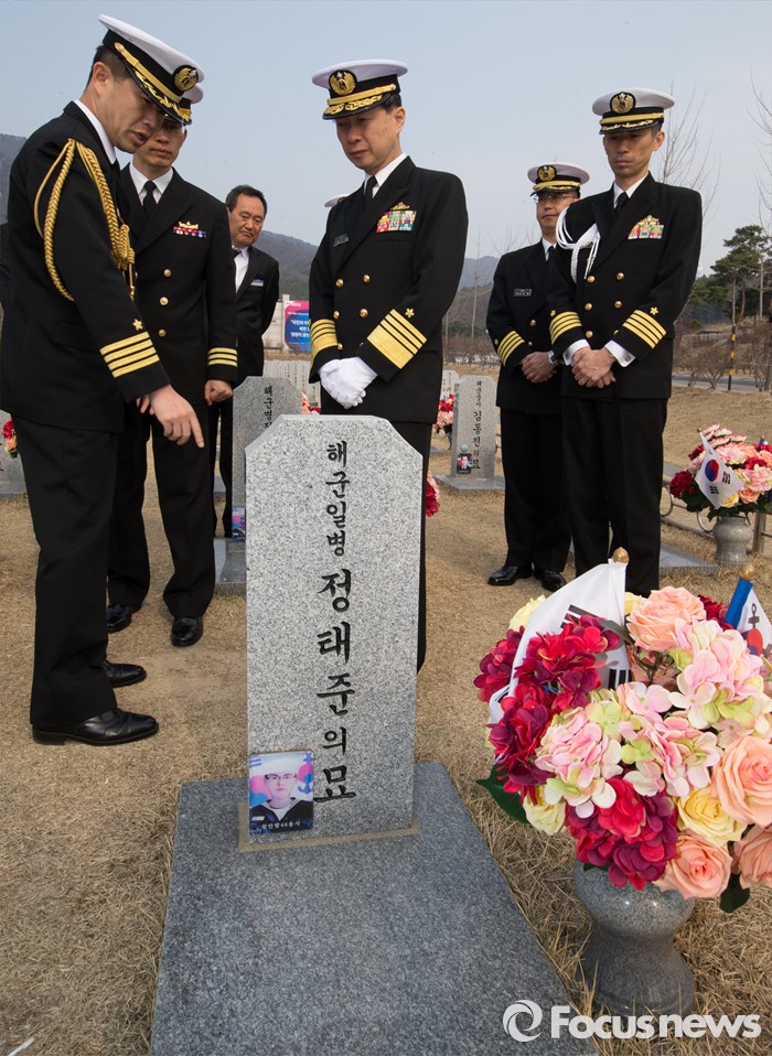(대전=포커스뉴스) 다케이 도모히사 일본 해상막료장(해군참모총장)이 29일 오전 대전 유성구 국립대전현충원을 방문, 천안함 46용사 묘역을 둘러보고 있다.