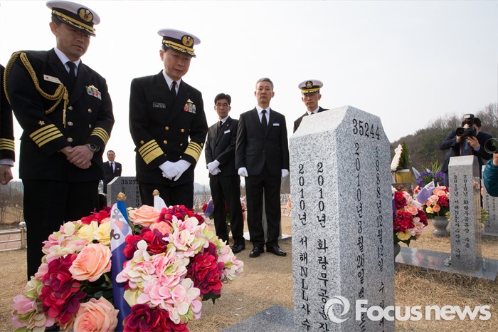 (대전=포커스뉴스) 다케이 도모히사 일본 해상막료장(해군참모총장)이 29일 오전 대전 유성구 국립대전현충원을 방문, 천안함 46용사 묘역을 둘러보고 있다.