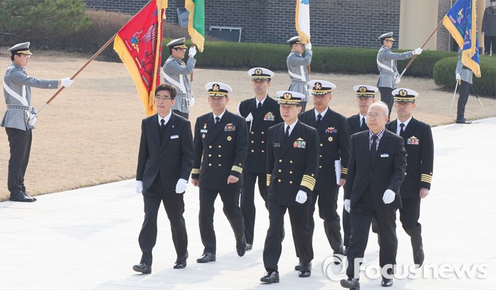 (대전=포커스뉴스) 다케이 도모히사 일본 해상막료장(해군참모총장)이 29일 오전 대전 유성구 국립대전현충원을 방문, 참배를 하기 위해 현충탑으로 이동하고 있다.
