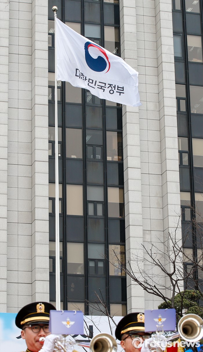 (서울=포커스뉴스) 29일 오전 서울 종로구 정부서울청사에서 대한민국 정부기 게양식이 열렸다. 이날 행사에 참석한 해병대 군악대가 새 정부기 게양을 축하하고 있다. 정부는 67년간 사용해온 '무궁화'에서 '태극' 도안으로 바뀐 새 정부기를 정부세종청사와 서울청사 등 10개 청사에 게양했다.