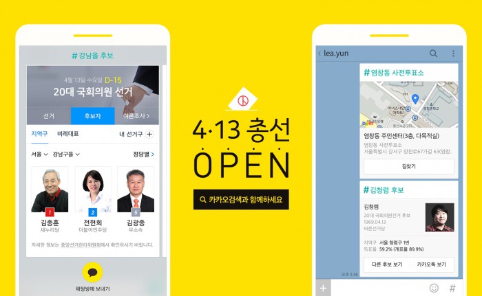 선거 당일에는 샵(#)검색을 활용해 실시간으로 개표결과를 친구에게 공유하고, 총선 개표방송을 검색해 카카오TV로 친구들과 대화하며 개표방송을 시청할 수도 있다. 카카오는 이를 통해 모바일 시대의 핵심인 소셜과 라이브방송을 접목한 차별화된 선거 방송 시청 경험을 제공한다는 방침이다.
