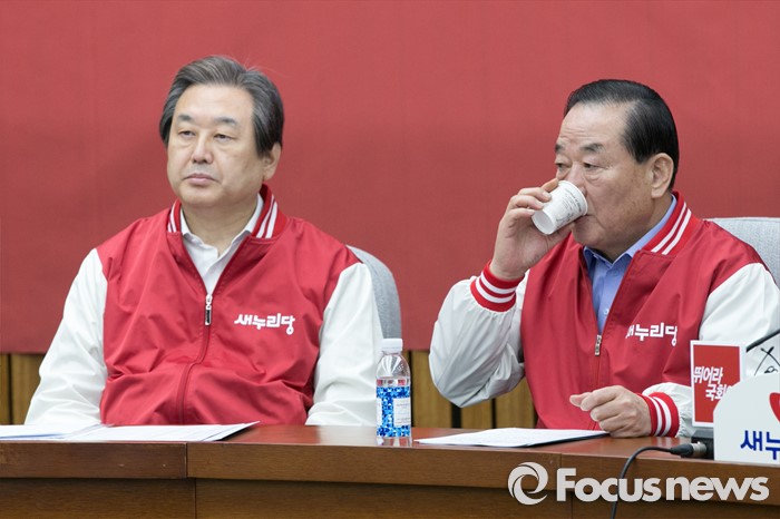 (서울=포커스뉴스) 서청원(오른쪽) 새누리당 최고위원이 29일 오전 서울 여의도 국회에서 열린 첫 중앙선거대책위원회의에 참석해, 물을 마시는 동안, 김무성 대표가 생각에 잠겨 있다.